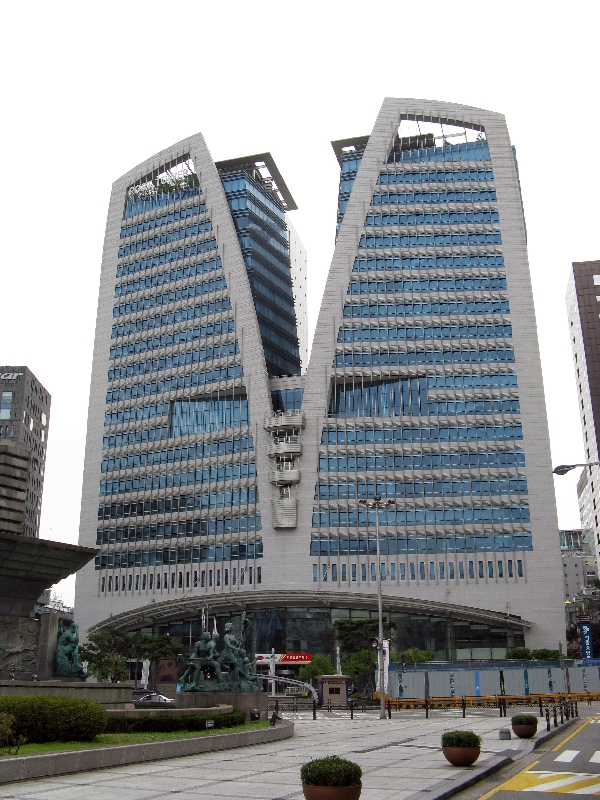 culture of Korea during their occupation (1910-1945). An now, across from the bank building is Post Tower. It is one of a growing number of highly designed skyscrapers in Seoul with multiple angles, curves and planes that probably couldn't have been successfully designed and build prior to access to powerful computers. |