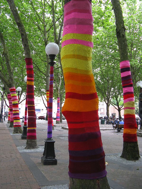 in several towns in the Northwest. The knitted art installation shown here