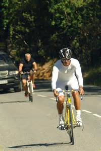 Liev Schreiber (actor) and Naomi Watts (actress) regularly bicycles in NYC. (left) Arnold Schwarzennegger (politician) rides on California trails with a posse of body guards. (right) |