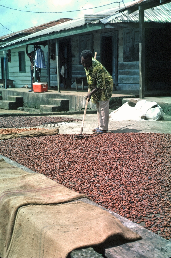 system for drying cocoa (left). More typically cocoa is dried in the open by the