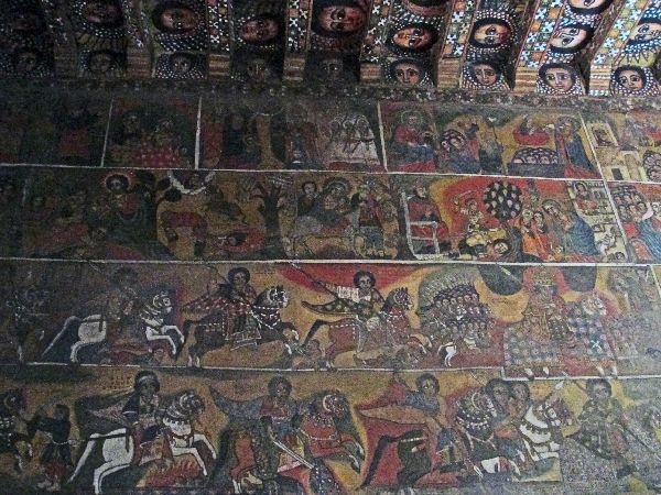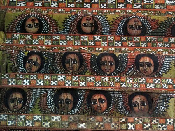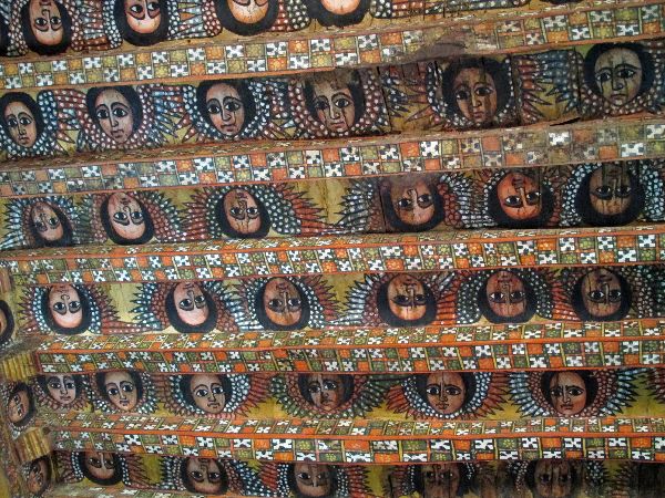 ![]() At least seven of the churches in Gondar date back to the period of the Fasilada's rule. A little newer is Debre Berhan Selassie church which was founded in 1690's by Iyasu I. It is believed that the original church was round, based on the ruminants of the foundation that extend beyond the current church. The construction date of the current building is not known but it is believed to have been in the late 18th century. Fortunately, due to the intervention of a swarm of bees, as the story goes, it is the one church of dozens in Gondar that wasn't destroyed by the attack of the Dervish or Mahdist, of Sudan, in 1888. If it is any indication of any of the other churches at the time, the cultural and religious destruction by the Mahdist was substantial. |