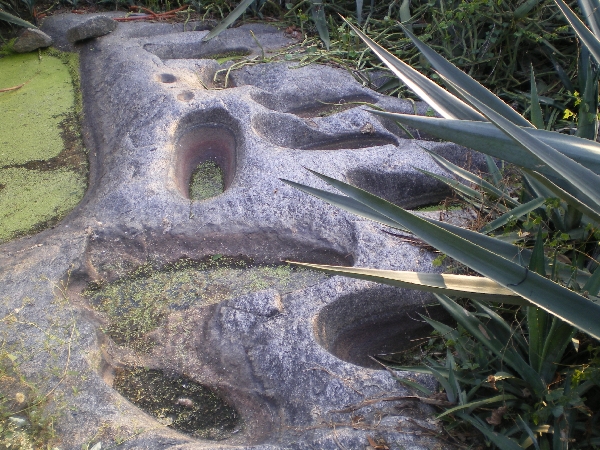 rock covered with dozens of deep, man-made grooves carved from generations of